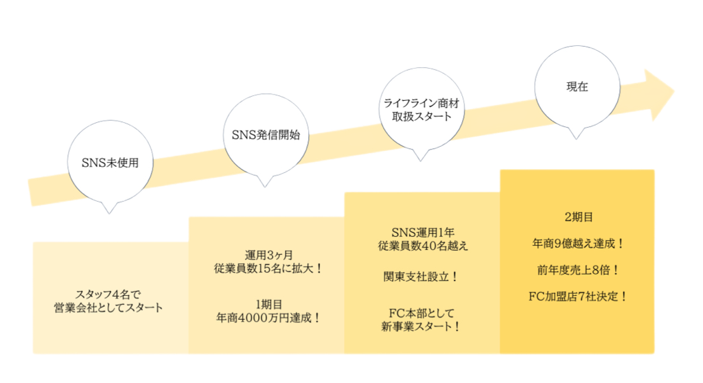 集客を行っております。SNSのみで30名以上の従業員を採用・FC加盟店7社決定・売上8倍・年商9億を達成しております。
